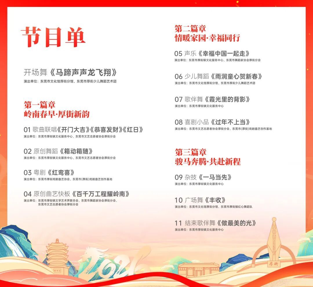 2月10日,“‘粤美村晚’迎新春·骏马贺岁福万家”2026年厚街镇新春文艺晚会将在溪头广场举行。活动设置挥春送福、传统美食集市、非遗民俗体验、文艺汇演四大板块,深度融合厚街产业特色与岭南传统文化,有效激活基层文艺力量。晚会还特别设置“感恩同行”环节,为“社区合伙人”代表颁发感谢状,并向新就业群体代表赠送暖心礼包,传递城市关怀,以文艺赋能基层治理,为乡村注入温暖持久的文化动能。